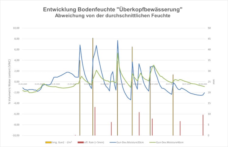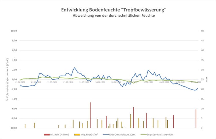In dieser Saison wurde auch untersucht, wie sich die Bodenfeuchte entwickelt. Zu diesem Zweck wurden Bodensensoren in zwei Tiefen von 26 und 46 Zentimetern platziert.