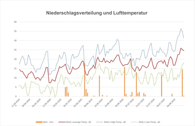 Ideal ist es, wenn für die Bewässerungssteuerung Daten einer eigenen Wetterstation berücksichtigt werden. Diese sollte neben den üblichen Werten wie Temperatur, Niederschlag, Windrichtung und Windstärke, die Luftfeuchtigkeit, Sonnenstrahlung sowie die sich aus den Daten ergebende Verdunstung bereitstellen. Die nachfolgende Grafik zeigt, die Temperaturverhältnisse in der Zeit von der Pflanzung bis zum Krautabtöten. Dargestellt wird der tägliche Niederschlag in Millimeter (mm) sowie die mittlere, Höchst- und Tiefsttemperatur in Grad Celsius (°C).