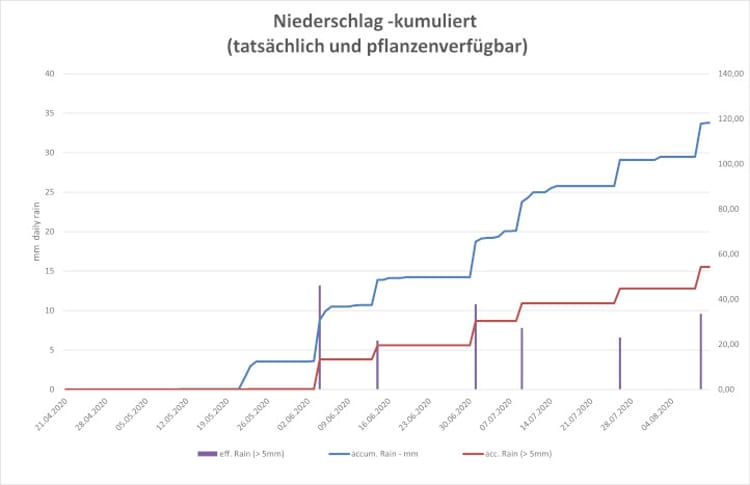 Die Niederschlagsdaten zeigen, dass während der gesamten Saison nur an sieben Tagen Niederschlag in einer pflanzenverfügbaren Menge fiel, insgesamt 54,4 l/m². Das entspricht 46 Prozent der gesamten Niederschlagsmenge.
