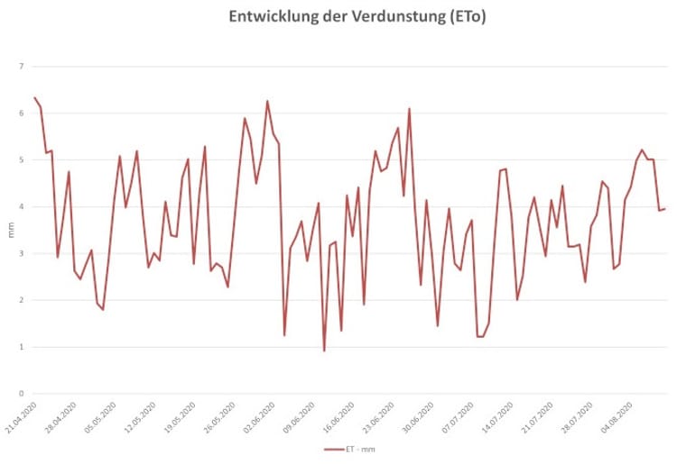 Zu sehen ist, dass die tägliche Verdunstung im Mittel bei 3,7 l/m² liegt. Im Betrachtungszeitraum sind so insgesamt 418 l/m² verdunstet. Diese Verdunstungswerte der Wetterstation bedürfen aber noch der Überarbeitung, da sie, vergleichbar mit dem Deutschen Wetterdienst, für Grasland ermittelt werden somit auf die Kartoffeln nicht eins zu eins übertragbar sind. Zudem spiegeln die Werte die potenzielle Verdunstung wider. Vereinfacht ausgedrückt, ist das die Wassermenge, die im Idealfall verdunsten könnte, wenn sowohl der Boden als auch die Pflanzen optimal mit Wasser versorgt sind. Da dies nicht immer der Fall ist, liegt die tatsächliche Verdunstung meist unter diesem Wert. Ziel einer bedarfsgerechten Bewässerung ist es, sich mit den zusätzlichen Wassergaben der potenziellen Verdunstung anzunähern.