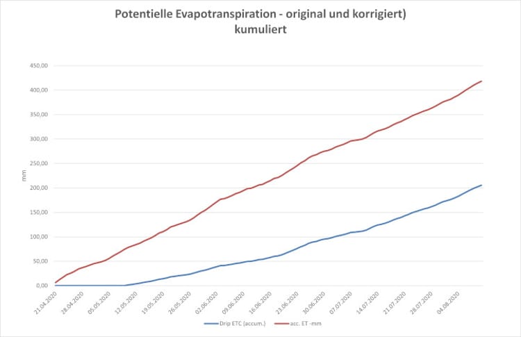 Unter Zugrundelegung der Korrekturfaktoren (kc-Faktor) wie sie die Fachhochschule Geisenheim auf ihrer Internetseite für Kartoffeln veröffentlich hat (Stand 2019), ergibt sich sogar noch ein Defizit. Die potenzielle Verdunstung liegt nach dieser Rechnung bei 331 l/m². Bei einer Bewässerungsmenge von 174,9 l/m² beträgt das Defizit 101,7 l/m².