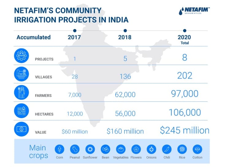 The scope of the regional irrigation projects won by Netafim to date involves 202 villages in India and over 97,000 farmers over 100,000 hectares (247,105 acres) area. The transition to precision irrigation is expected to double the agricultural output, improve its quality and save about 40% in water and fertilizer consumption.
