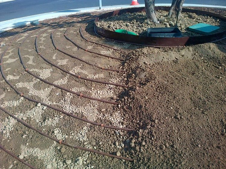- Tropfrohre unter der Erde: Abhängig von der Bodenqualität und der Pflanzenart werden Tropfbewässerungsrohre meist 15 bis 20 cm tief in die Erde gelegt. Die Tropfrohre sind dann im Landschaftsbild nicht sichtbar und auch vor Vandalismus geschützt. Gleichzeitig hat die unterirdische Verlegung weitere Vorteile und hilft den Arbeitsaufwand zu reduzieren.
